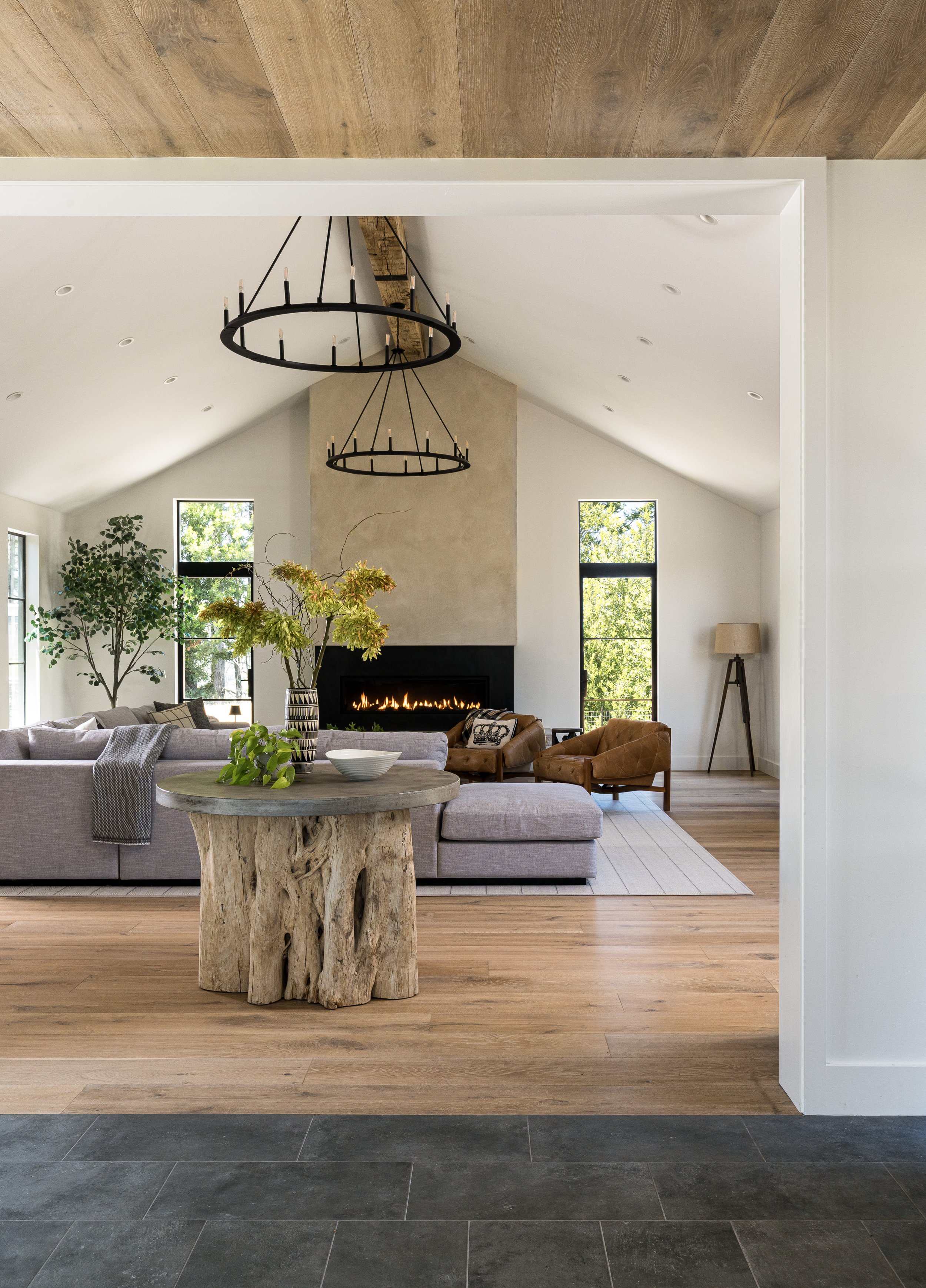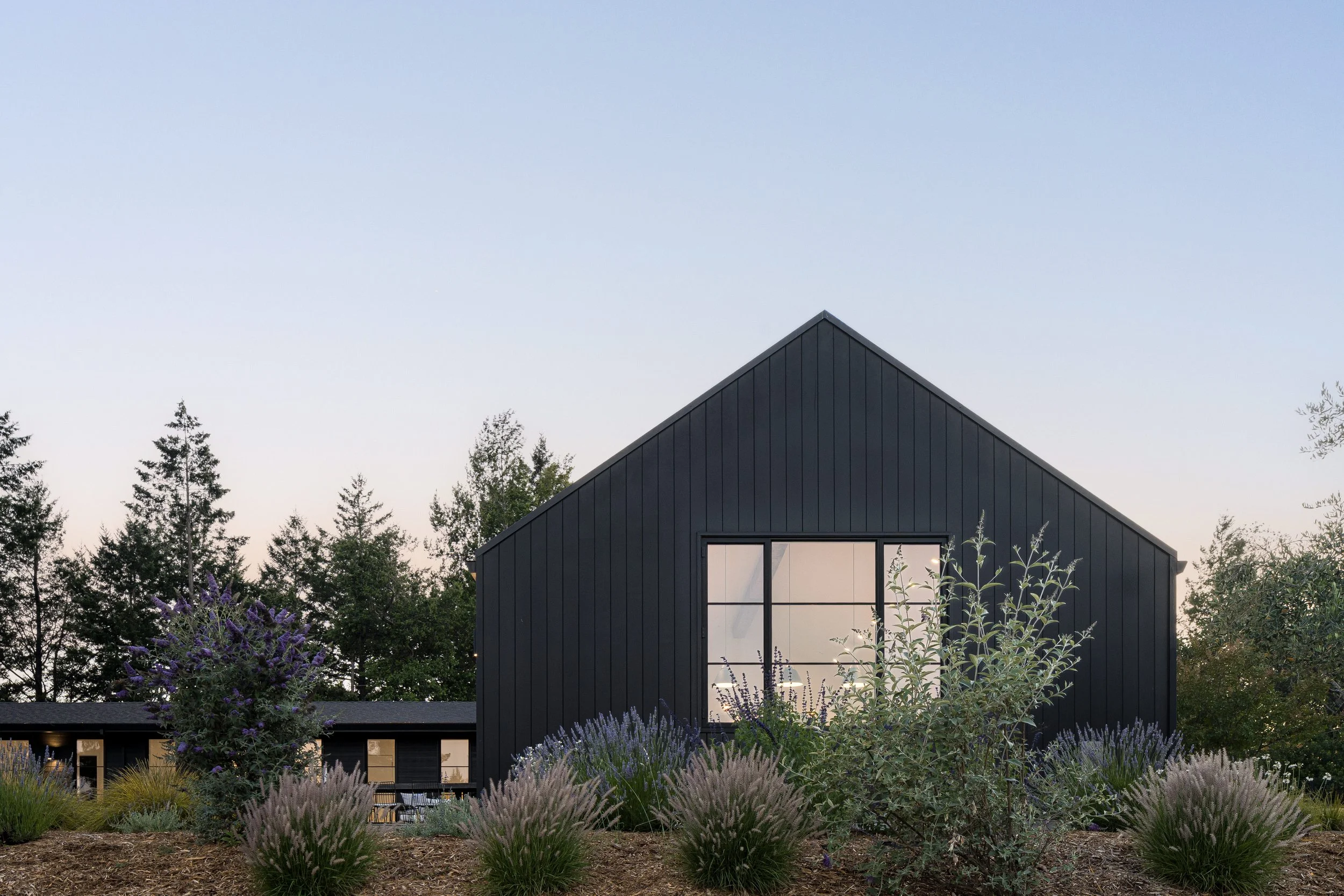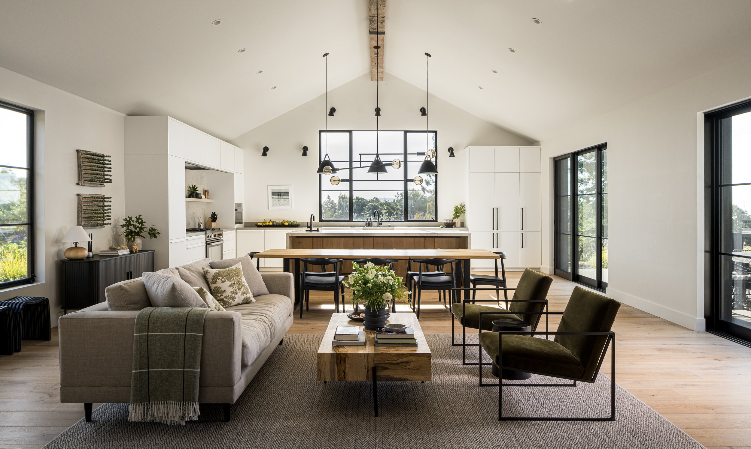 This 3,200 square foot home was built from the ground up, after the previous dwelling was destroyed in a wildfire. The concept for the home was inspired by local barns and the surrounding landscape. Simple forms, authentic textures and a palette of greens and ochres combine to create a space ideal for relaxing and reconnecting with family and friends.